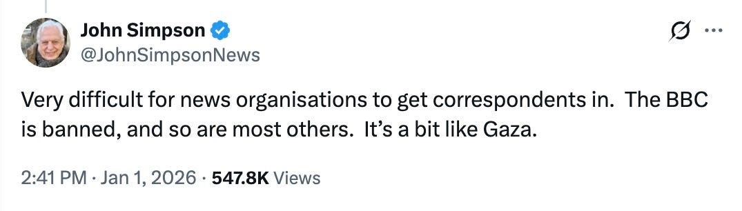 So now that the people appear to be rising up, why aren’t those who are committed to human rights out on the streets condemning the regime? Why did it take the BBC so long to cover the protests at all? Veteran BBC reporter John Simpson attempted an answer. ‘Very difficult for news organisations to get correspondents in’, he wrote on X. ‘The BBC is banned, and so are most others. It’s a bit like Gaza.’