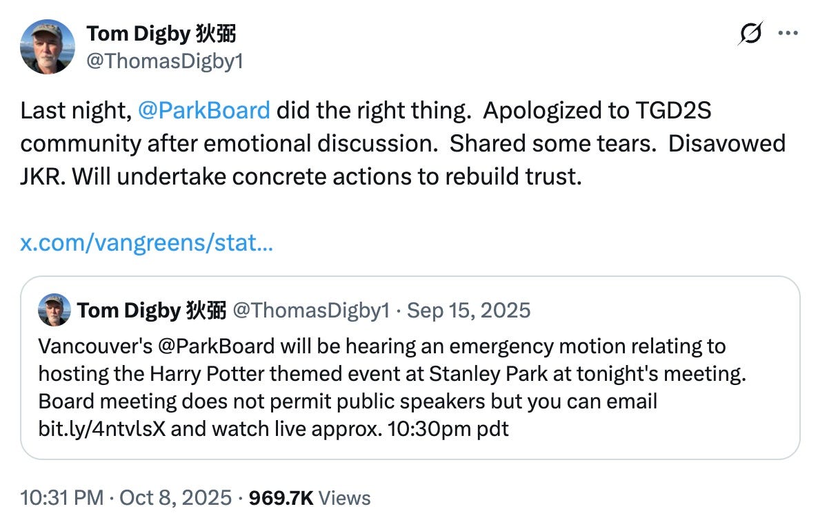 To give yet another example from Canada, now ground zero for the demolition of gay respectability, last September the chair of the Vancouver Board of Parks and Recreation considered an ‘emergency motion’ regarding a Harry Potter event in Stanley Park. The resolution was later announced on social media: ‘Apologized to TGD2S community after emotional discussion. Shared some tears. Disavowed JKR. Will undertake concrete actions to rebuild trust.’