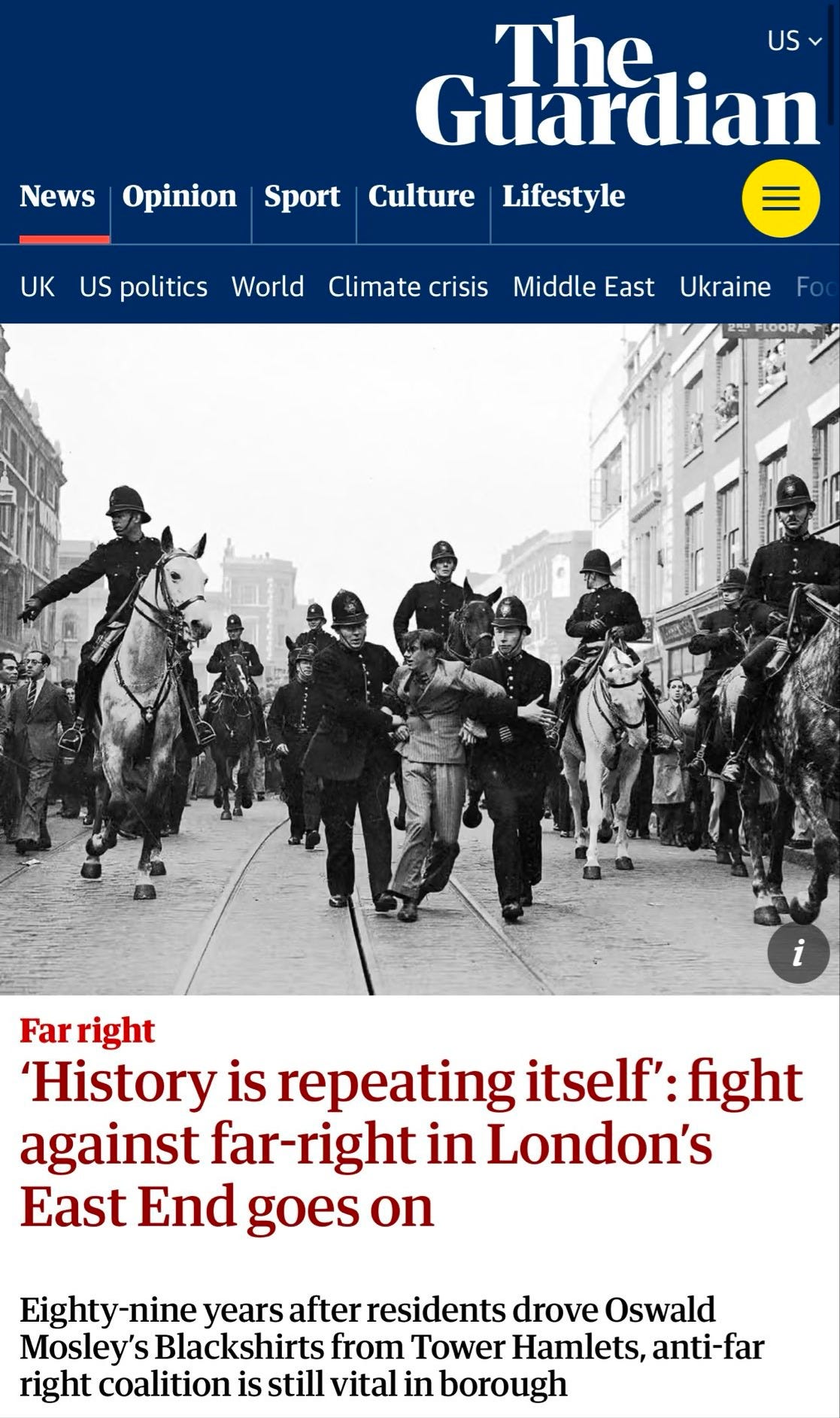 Incredibly, the Guardian had attempted to spin the situation as a rerun of the ‘Battle of Cable Street’ of 1936, when police attempted to escort Oswald Mosley’s British Union of Fascists (BUF) on their march through the East End, an overt gesture that was designed to intimidate the Jewish population. A coalition of working-class residents – including local Jews and Irish dockworkers – together with trade union groups and communist activists from outside the area, gathered to oppose the march. As the police sought to clear a path, clashes erupted with the counter-protesters. In the end, the police were forced to ask the BUF to take an alternative route.
