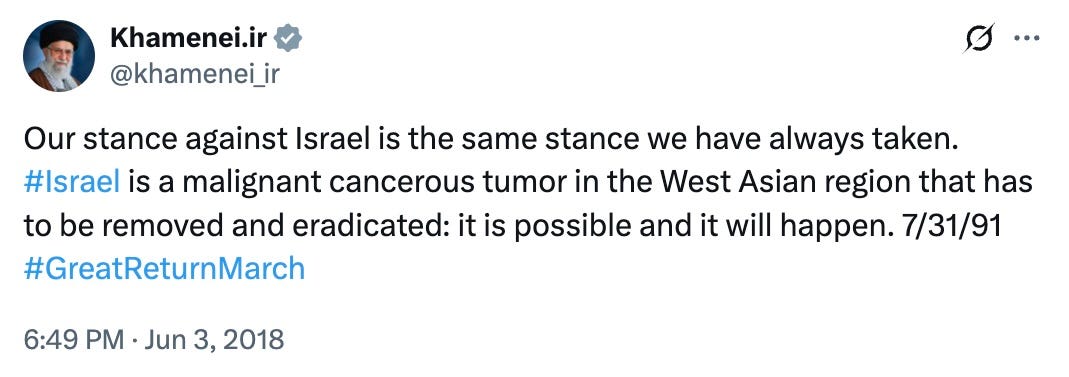 We are seeing this kind of dogged naivety on a much larger scale with the current conflict in the Middle East. In June 2018, the Supreme Leader of Iran, Ali Khamenei, called for the wholesale destruction of Israel.
